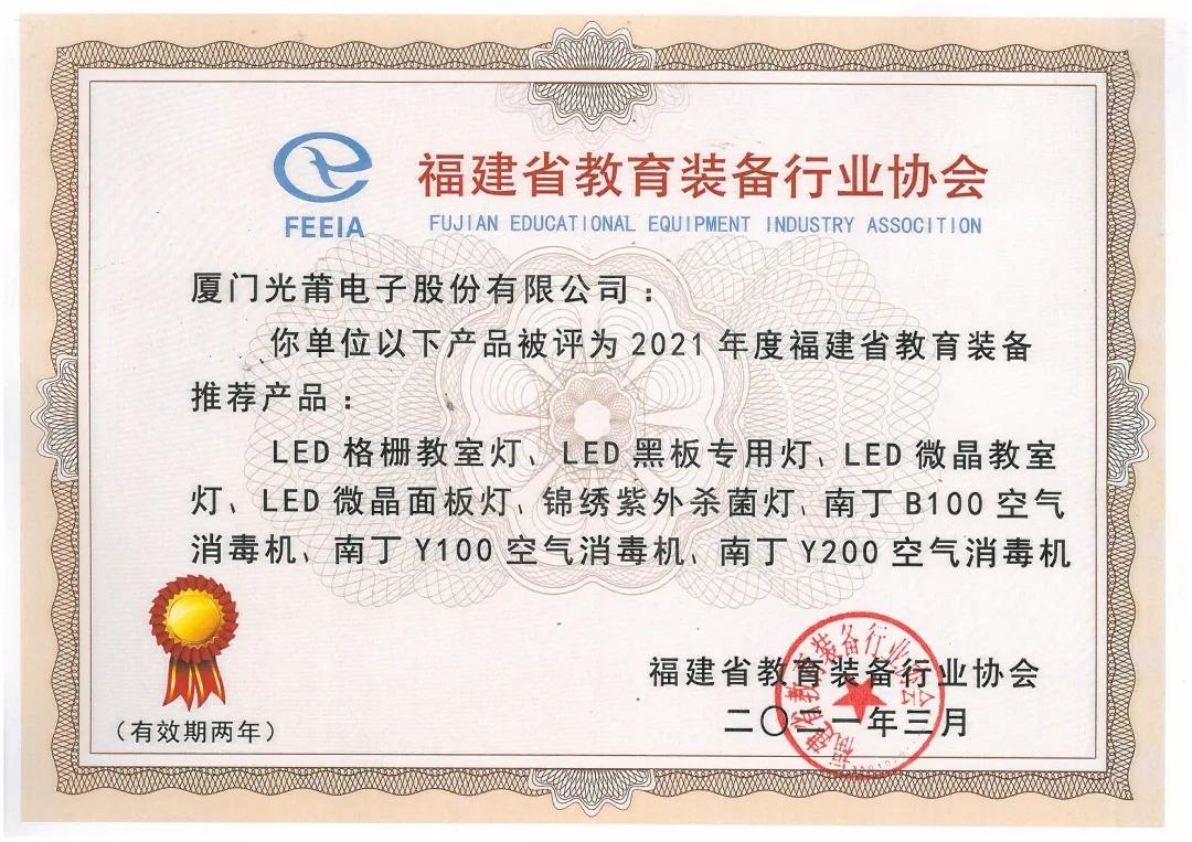 3月,,,,,福建省教育装备行业协会宣布了“2021年度福建省教育装备推荐产品目录”,,,,,今年会官网股份送选的8款产品(LED格栅课堂灯、LED黑板专用灯、LED微晶课堂灯、LED微晶面板灯、漂亮紫外杀菌灯、南丁B100空气消毒机、南丁Y100空气消毒机、南丁Y200空气消毒机)庆幸上榜,,,,,入选数目压倒一切。。。。。。。